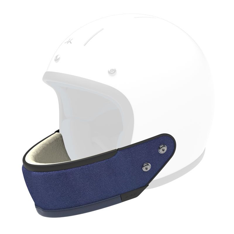 Mentonnière en carbone pour casque Veldt Montlhery. Casque gainé de toile bleu et intérieur blanc cassé en cachemire.
