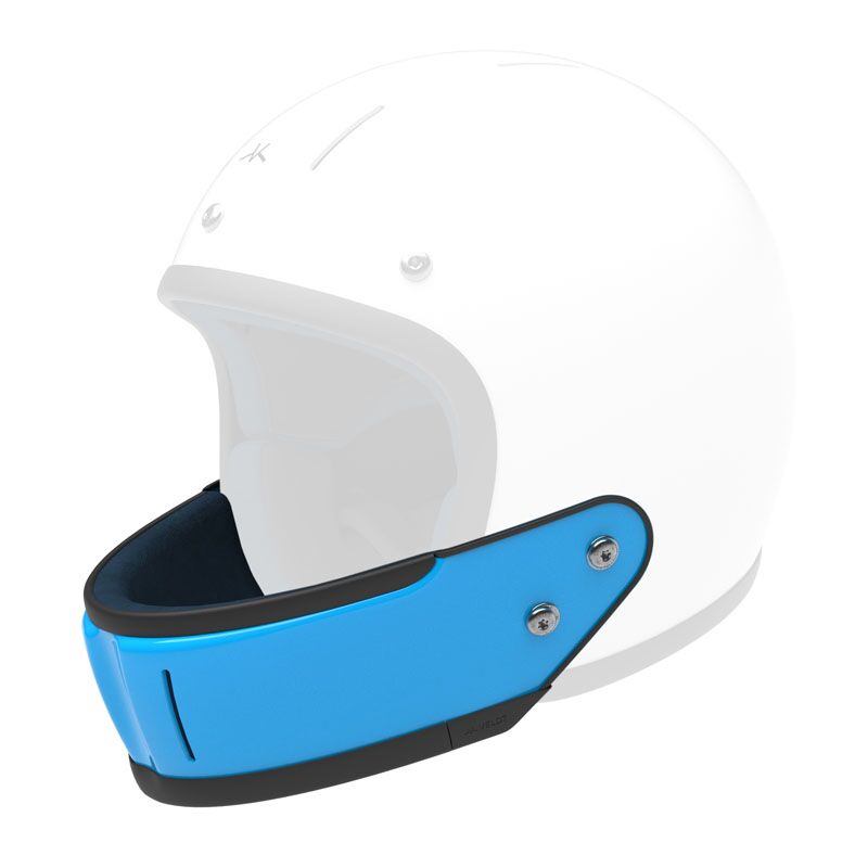 Mentonnière en carbone pour casque Veldt Montlhery. Peinture bleue, logo Vaillant et vernis brillant.