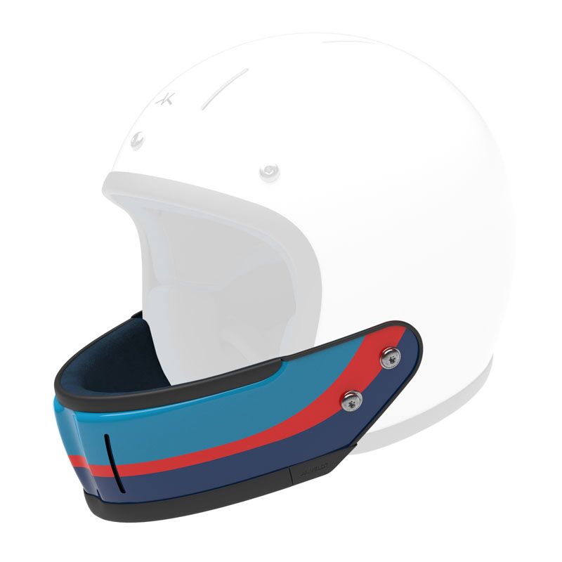 Mentonnière en carbone pour casque Veldt Montlhery. Graphisme rallye sur peinture bleue et vernis brillant.