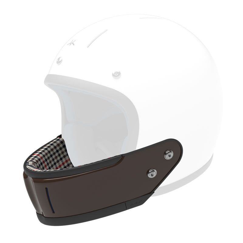 Carbon chinguard for Montlhery Veldt helmet. Hickory paint exterior with glossy varnish, lined with a Denholm