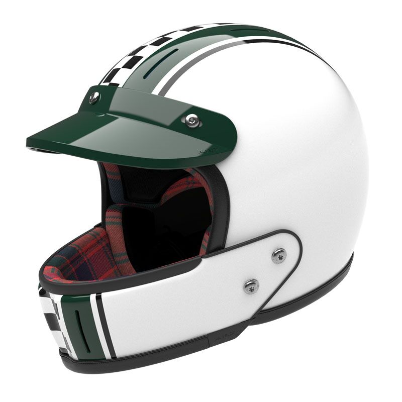Lightweight and protective carbon fullface helmet with a peak visor. Durable, comfortable interior that you can adjust to your morphology. Double D-ring fastening system and screws in titanium. 5 year warranty. Green and white colors and checkers of Le Mans Classic. The interior is lined with Scottish Tartan from Locharron.