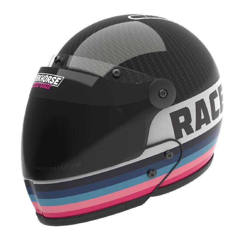 Lightweight and protective carbon fullface helmet equipped with a Class-1 optical quality shield and Pinlock 120 fog resistant insert lens. Durable, comfortable interior that you can adjust to your morphology. Double D-ring fastening system and screws in titanium. 5 year warranty. Raw carbon fiber, pastel colors and a ?go for it? hand sign and a glossy varnish. Comes with a plush zebra interior.